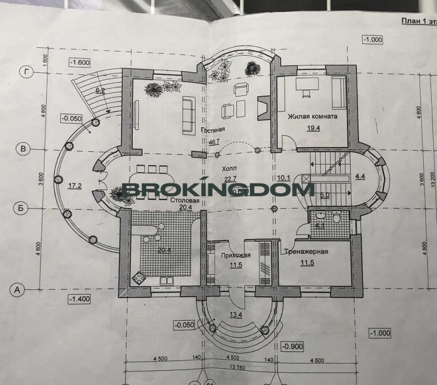 1 поверх – великий хол, кухня-вітальня, робочий кабінет, тренажерна, панорамний балкон.