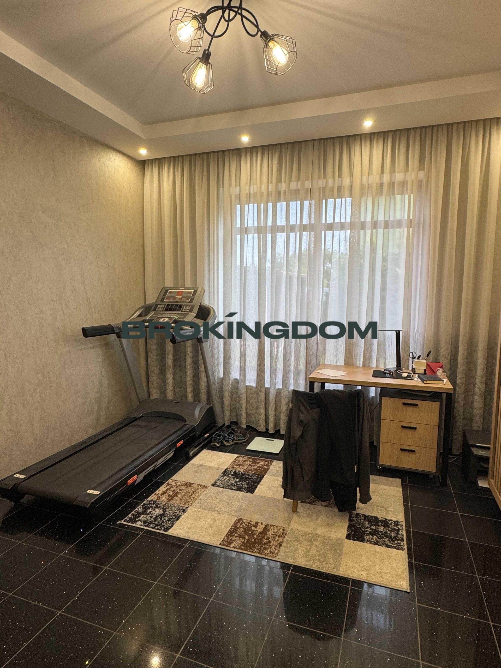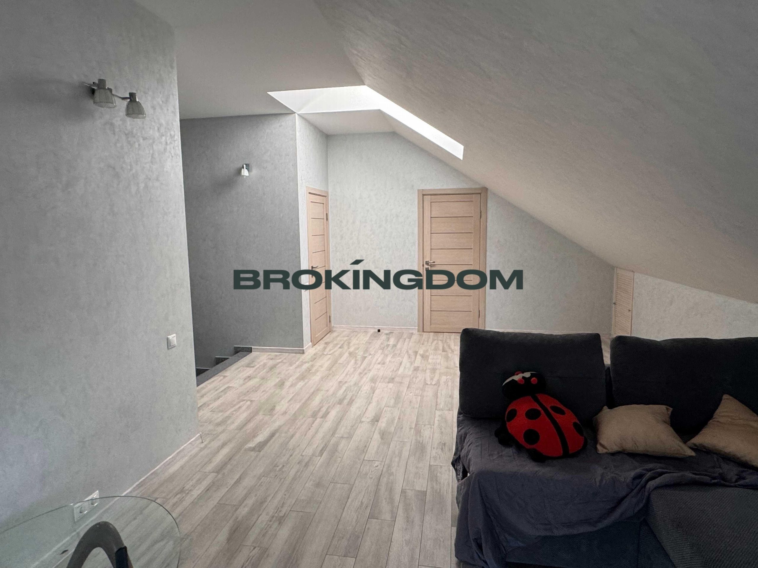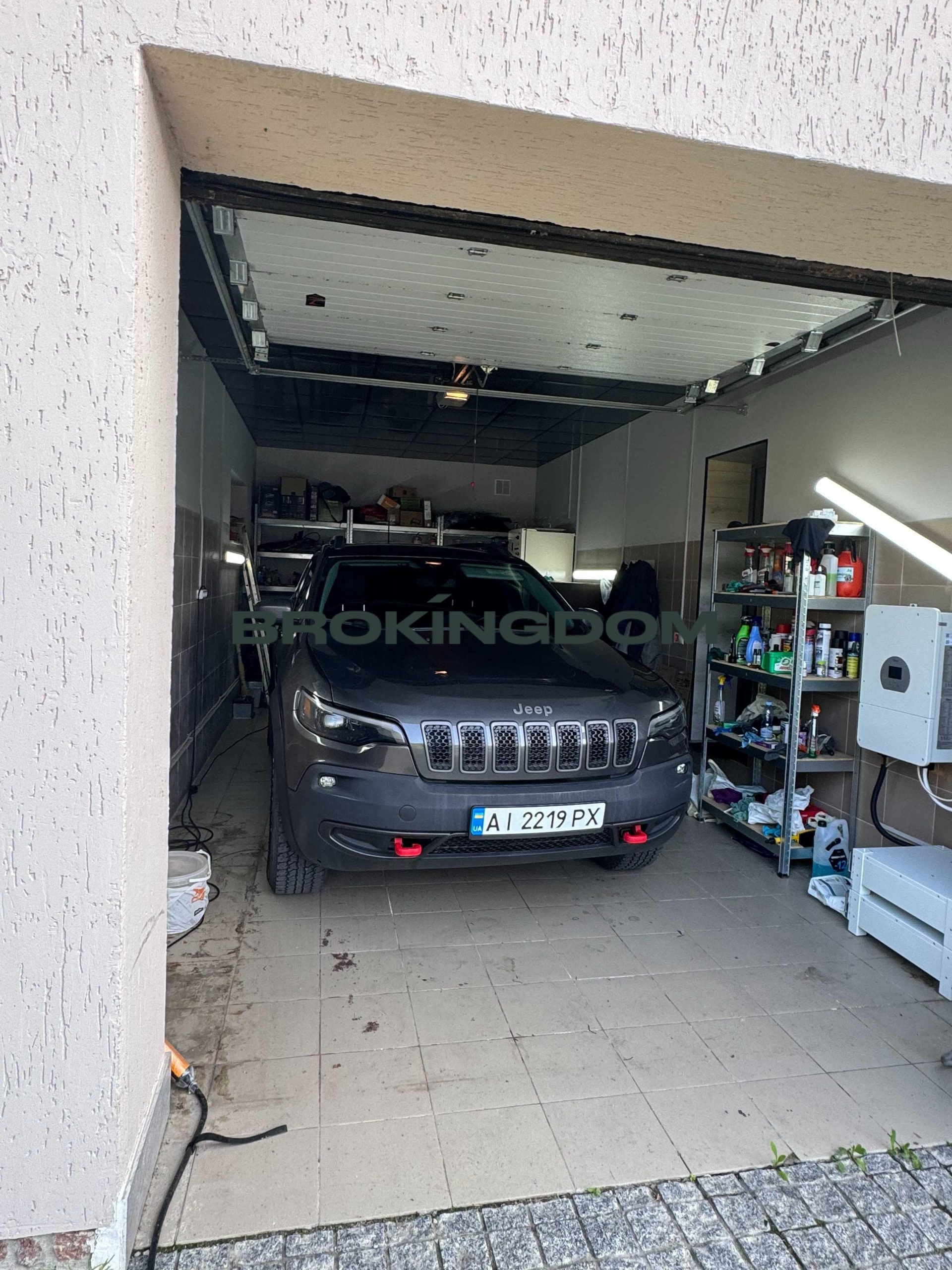 У будинку на першому поверсі є великий гараж з автоматичними воротами, великими стелажами. Великий хол, шафа-купе, дизайнерська індивідуальна плитка на підлозі. Величезна кухня вітальня 50м2, камін, кондиціонер, панорамні вікна, всі меблі та побутова техника. Спальня, санвузол з душовою, кабінет, велика гардеробна, котельня.