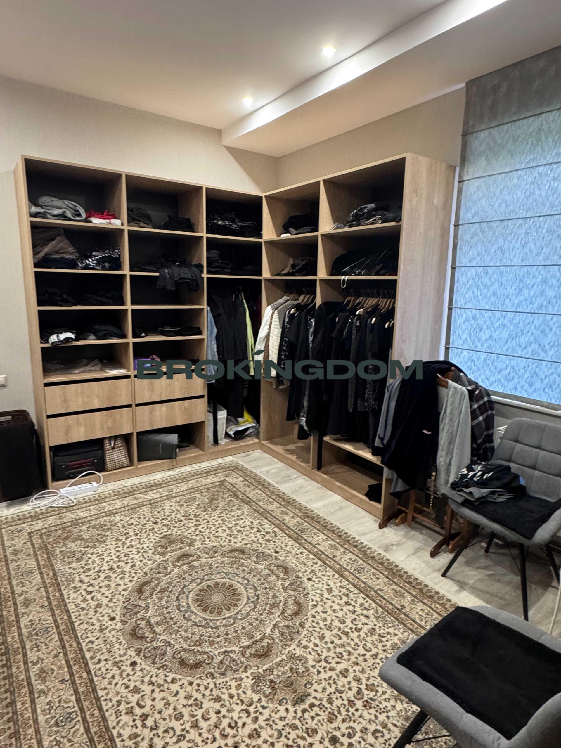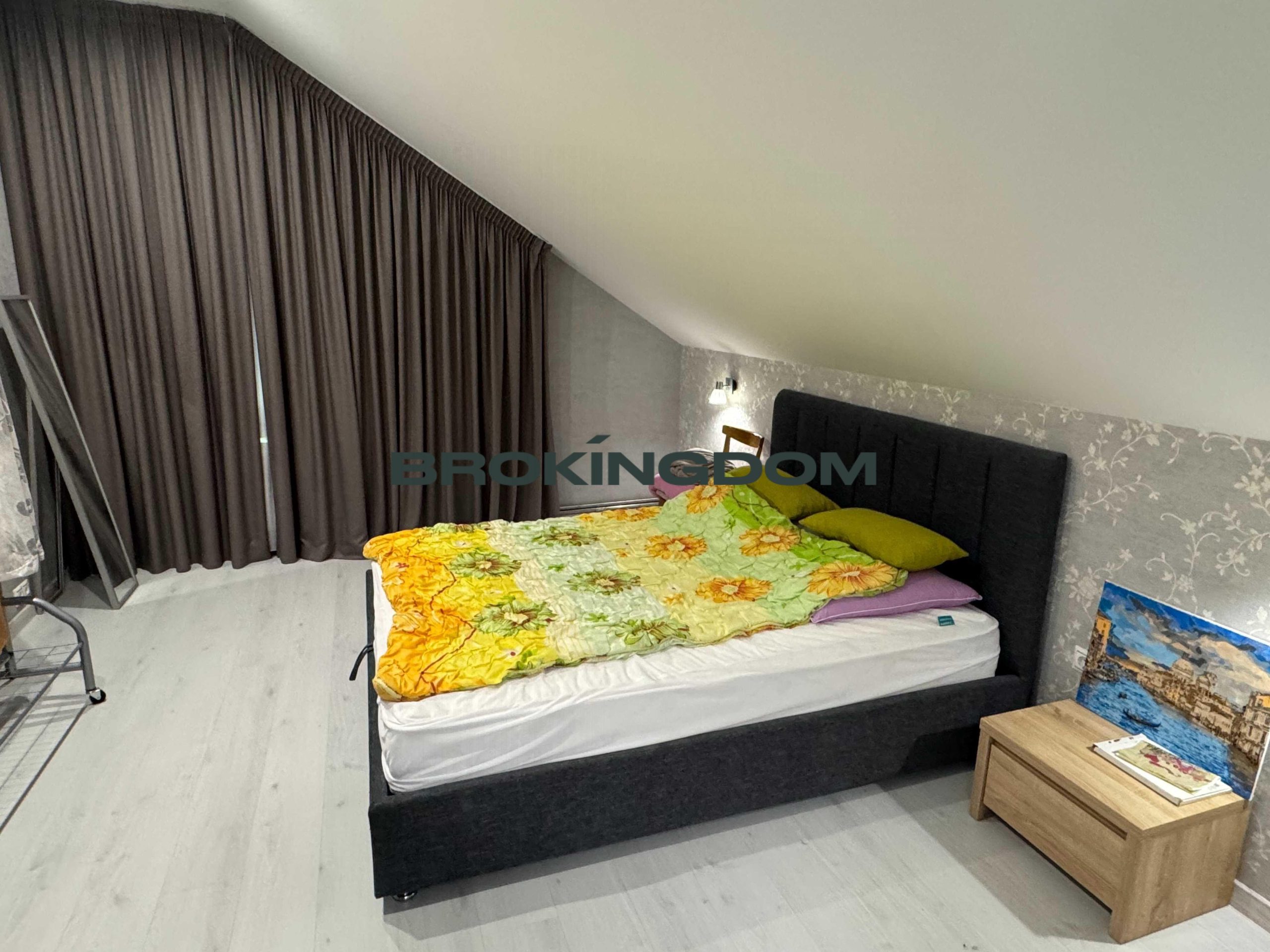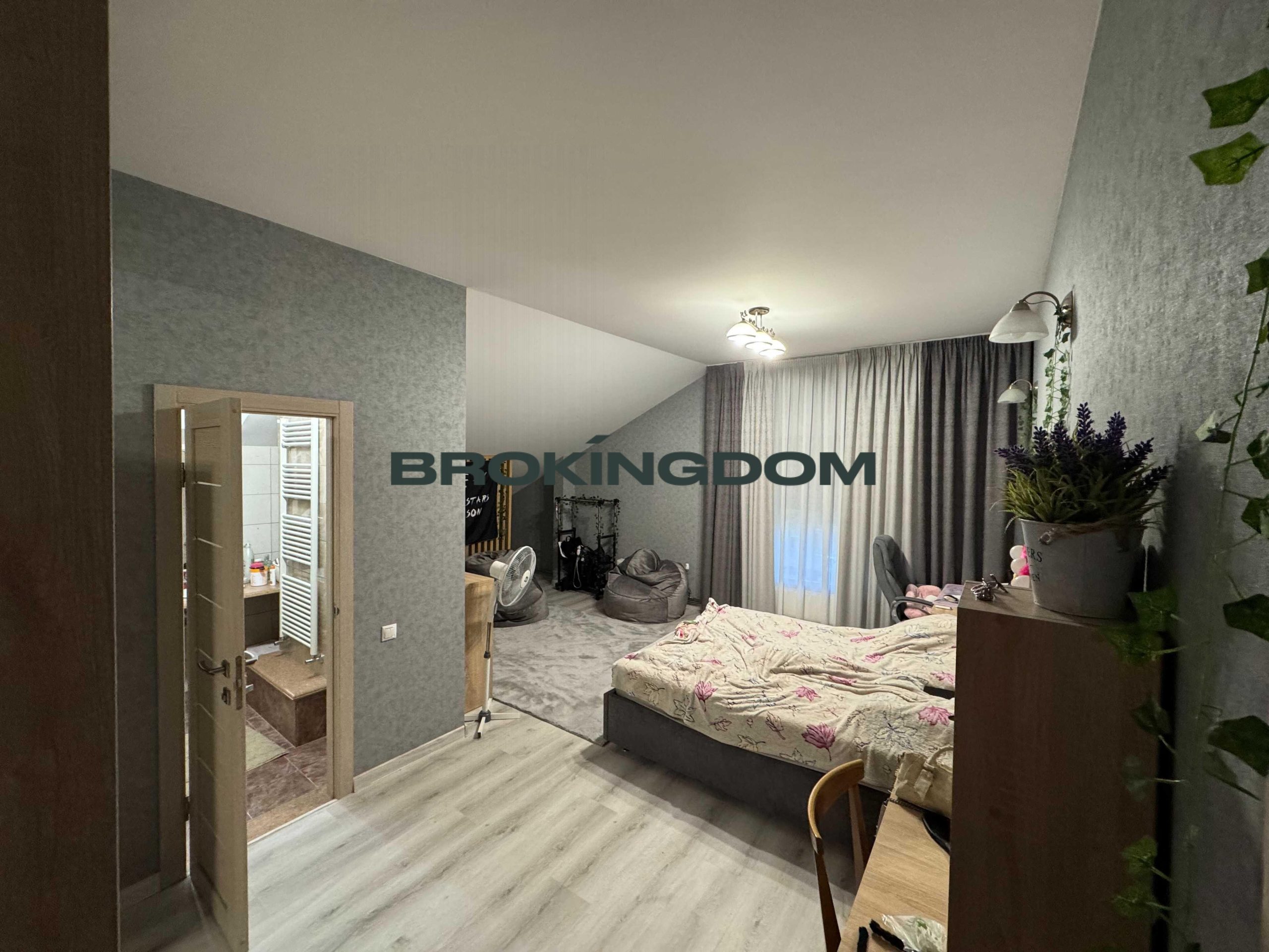 У будинку на першому поверсі є великий гараж з автоматичними воротами, великими стелажами. Великий хол, шафа-купе, дизайнерська індивідуальна плитка на підлозі. Величезна кухня вітальня 50м2, камін, кондиціонер, панорамні вікна, всі меблі та побутова техника. Спальня, санвузол з душовою, кабінет, велика гардеробна, котельня.