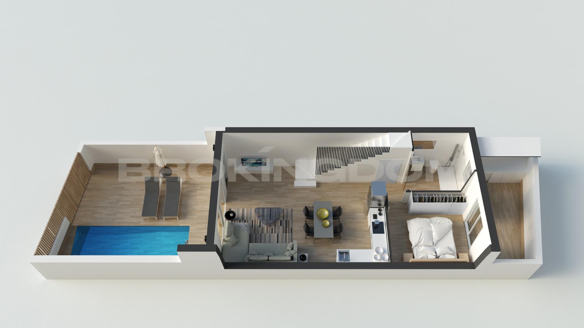 The ground floor of thisvilla comprises of an open plan lounge with large patio doors which lead into the garden with private pool, there is off road parking, a modern fitted kitchen with fitted appliances including oven, hob, extractor, fridge/freezer, dishwasher, washing machine and microwave, a double bedroom with fitted wardrobes and a fully fitted guest bathroom.